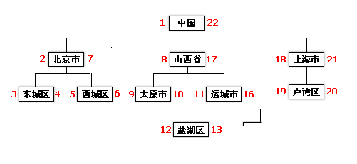 如图所示我们将一个树节点的左右各编上号码,就可以看出一些规律,山西的左右值为(8,17),那么所有左值大于8,右值小于17的节点都是属于山西的子节点。稷山先的左右值为(14,15),那么他的所有父节点就是左值小于14,右值大于15的节点,怎么样,用这个方法实现的无限级分类性能绝对是顶呱呱的。一次查询就可以查出属于某个节点的数据以及他子节点的数据。这个算是我见过性能最高的无限级分类算法。其他算法跟这个对比基本没有任何优势。