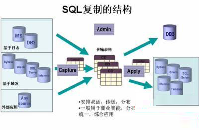 "SQL复制"又称为"DB2复制",是为 DB2 开发的两种数据复制类型中的一种,它是通过 SQL 进行的复制。在这里简单提一下,DB2 复制中的另一种"Q复制"是通过 Websphere MQ 消息队列进行的。在进行 SQL 复制时,Capture 程序读取 DB2 恢复日志以获取对指定源表的更改。该程序将更改保存到传输表格中,也称作变化数据表(changed data table),Apply 程序并行读取更改并应用于目标事务,见图1。